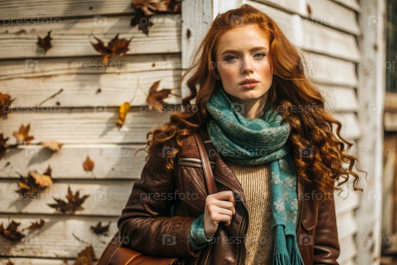 Осенний портрет. Близкий план молодой рыжеволосой женщины с выразительными зелеными глазами в коричневом кожаном куртке и бирюзовом шарфе
