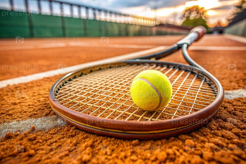 На грунтовом корте есть желтый теннисный мяч и теннисная ракетка. летний вид спорта. отличный теннис