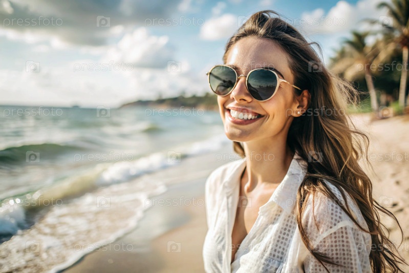 Красивая девушка в белой хлопковой рубашке и солнцезащитных очках на океане на фоне пальмовых деревьев. она улыбается и смотрит в камеру. летние каникулы и праздники