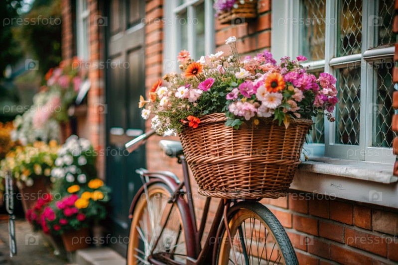 Красивый ретро-велосипед с цветами в корзине стоит за пределами летнего дома.Лето наступило.Городской транспорт