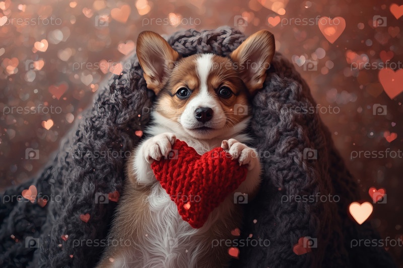 Концепция Дня святого Валентина. красное вязаное сердце в лапах щенка коргиса. открытка с бело-красной собакой, лежащей на вязанном одеяле