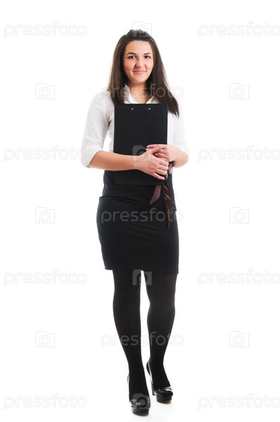 Молодая симпатичная бизнес-леди с папкой на белом фоне