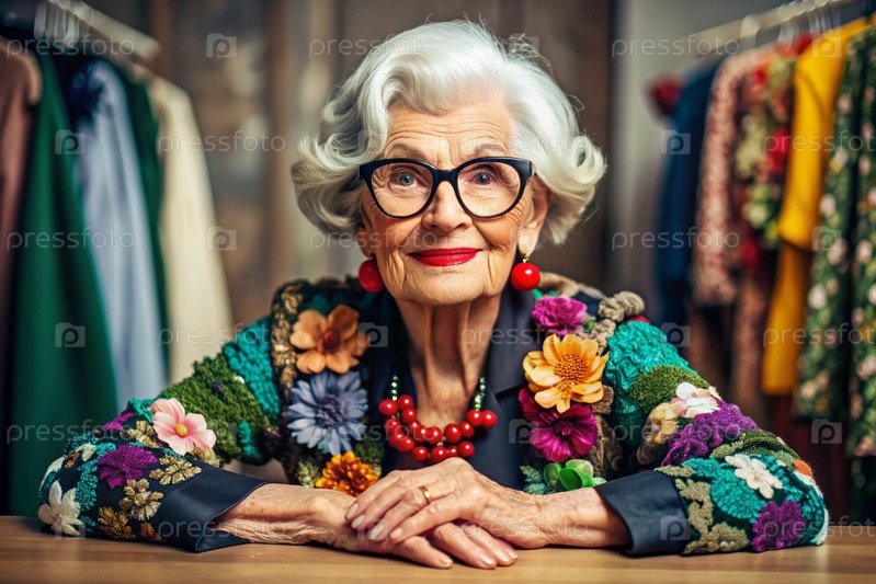 Портрет стильной, модной пожилой женщины, пенсионерки 70 лет, которая носит очки и одежду с цветочными оттисками