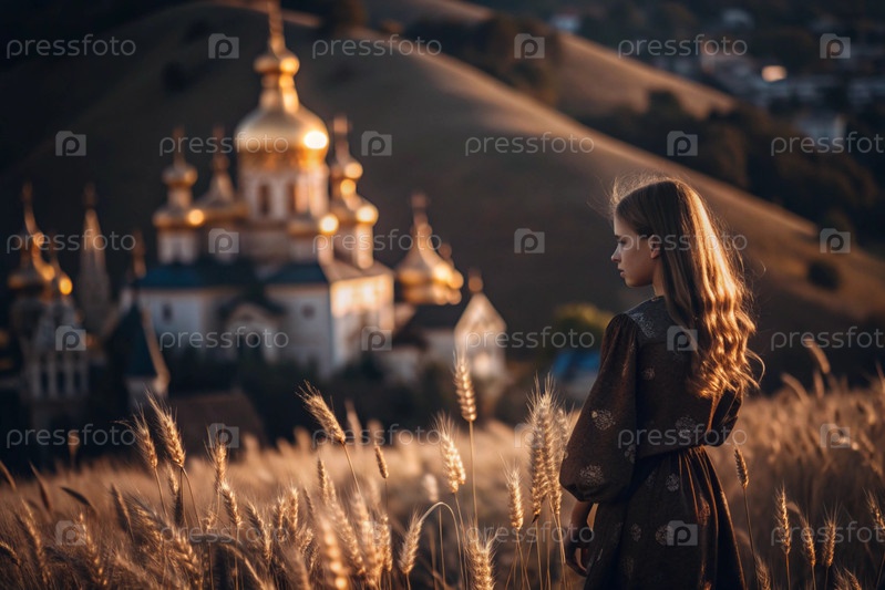 Молодая девушка в льняном платье на фоне поля спелых золотых пшениц и православной церкви при закате солнца