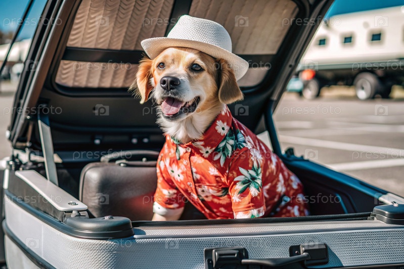 Стильный щенок в путешествии, очаровательная забавная собака в гавайской рубашке и шляпе, сидящая в открытом чемодане