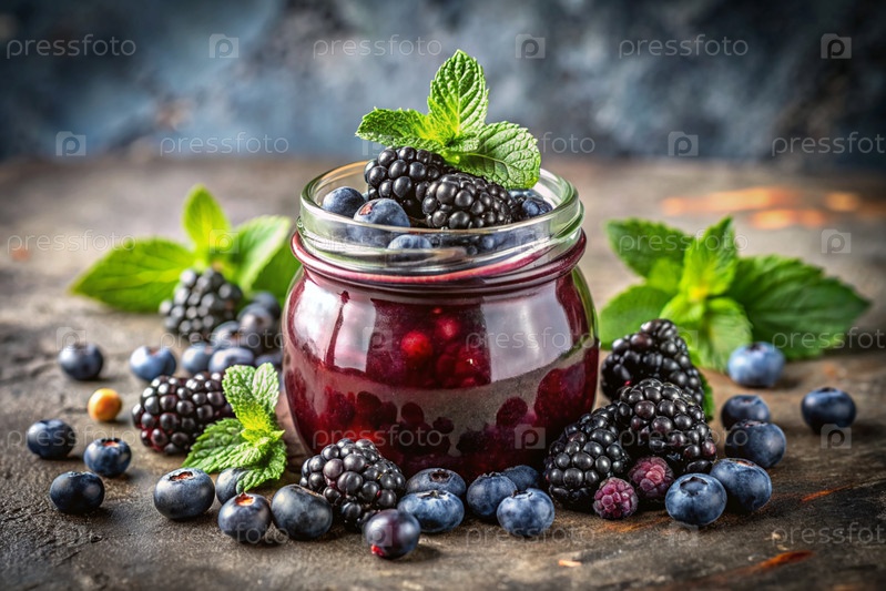Банка домашней черники, здоровый варенье с мятой на чёрном фоне.Сохранение и уборка летом