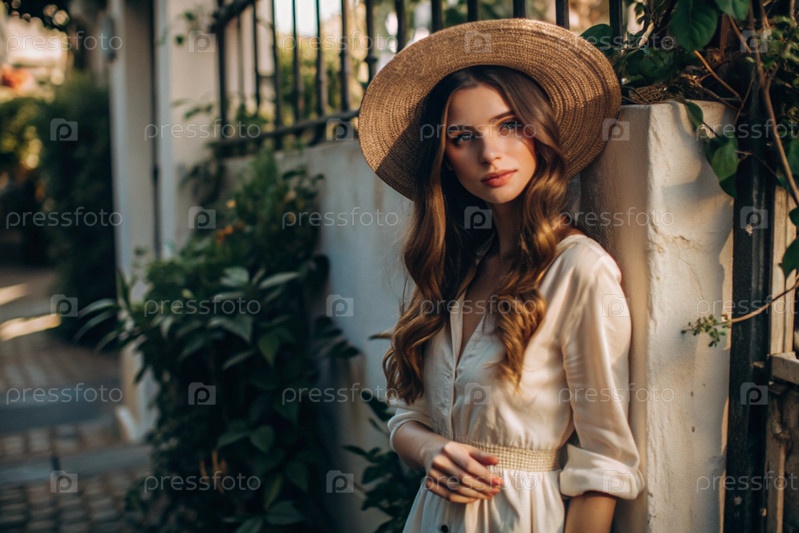 Красивая девушка в белом светлом платье и соломенной шляпе на улице летнего города.Она смотрит в камеру.Летние каникулы