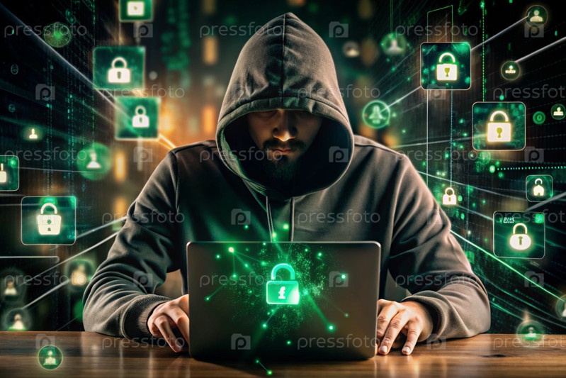 Хакер работает на ноутбуке, цифровые коды на виртуальном фоне. взлом и защита онлайн-данных. цифровые технологии, разработка программного обеспечения