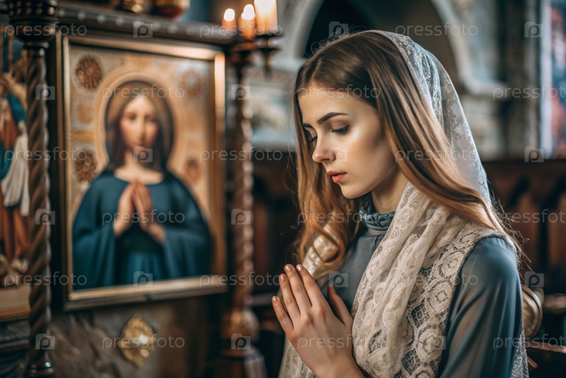 Портрет красивой молодой женщины с платками в православной церкви.Девушка молится в церкви среди икон