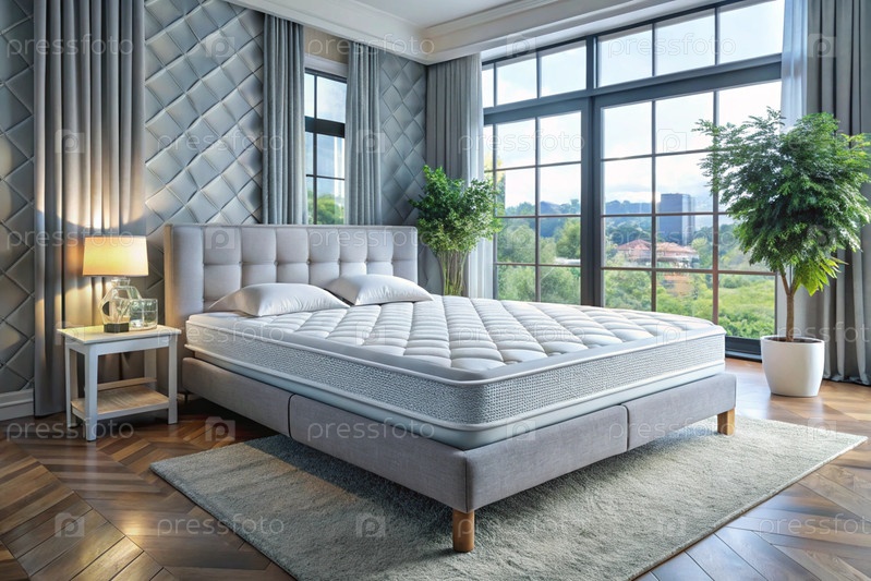 Новый белый роскошный комфортабельный ортопедический матрас на кровати в светлой спальне