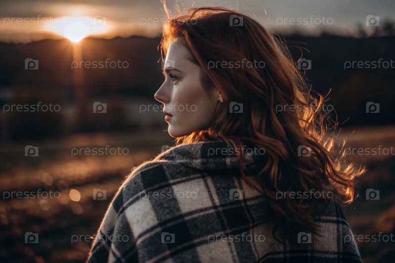Портрет красивой рыжеволосой женщины, завернутой в клетку под лучами заходящего солнца.Уютные осенние вечера на природе