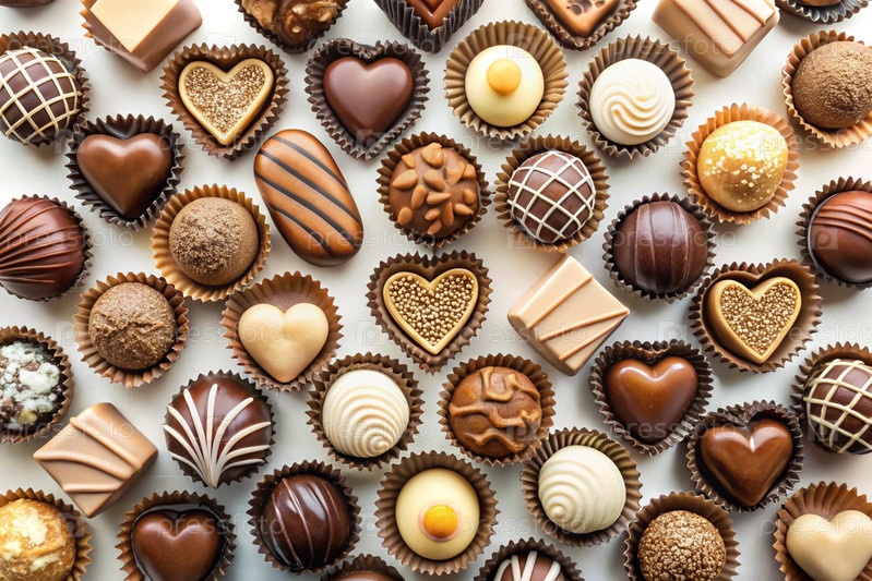 Ассортимент изысканного шоколада, белого, темного и молочного. История сладостей. Концепция Дня святого Валентина