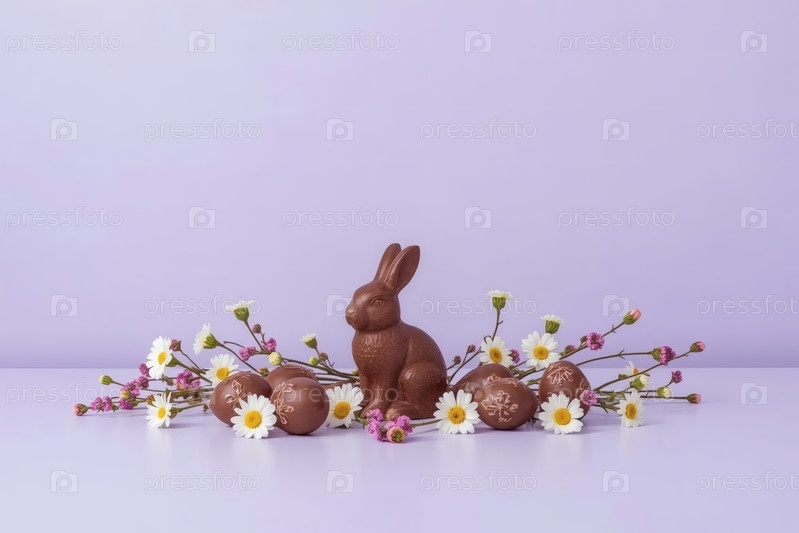 Счастливая Пасха 2026, минималистическое студийное фото. Шоколадный пасхальный кролик, пасхальные яйца и нежные весенние цветы. Мягкое освещение студии создает ощущение чистоты и воздушности