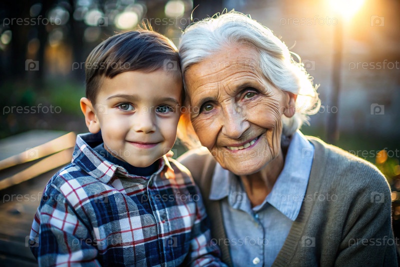 Счастливая семья, ребенок и бабушка обнимаются на улице в парке, счастливы и довольны