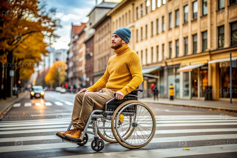 Человек в инвалидной коляске едет по осеннему городу. Движение людей с ограниченной подвижностью. Инвалидность. Проблемы со здоровьем. Здоровье, страхование жизни и здравоохранение