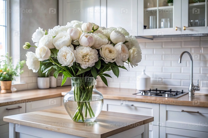 Красивый белый букет пион на золотой подносе на столе.На заднем плане интерьер современной белой кухни в скандинавском стиле.Концепция домашнего комфорта