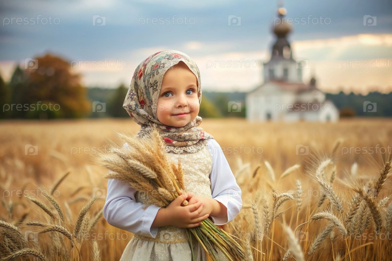 Русская девушка в белом платье и русском полотенце держит золотые колосья пшеницы на фоне созревающего поля и православной церкви