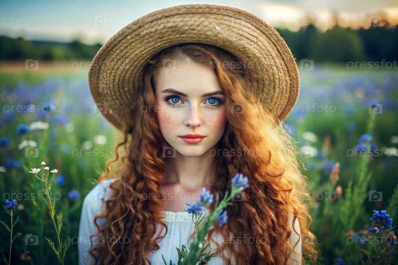 Портрет красивой кудрявой девушки в соломенной шляпе на цветочном поле.Девушка позирует и смотрит в камеру