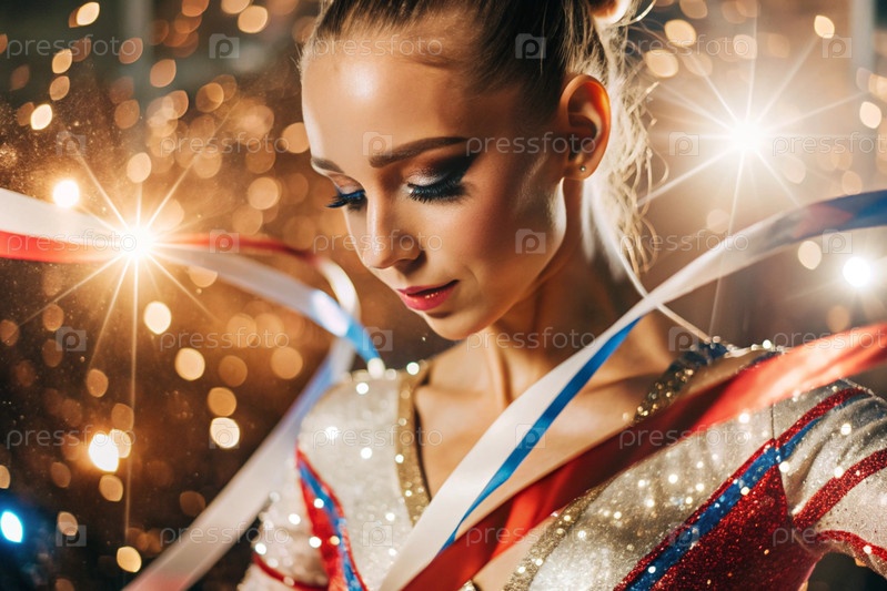 Ритмическая гимнастика - это крупный план красивой гимнастки с лентой в центре внимания на спортивной арене