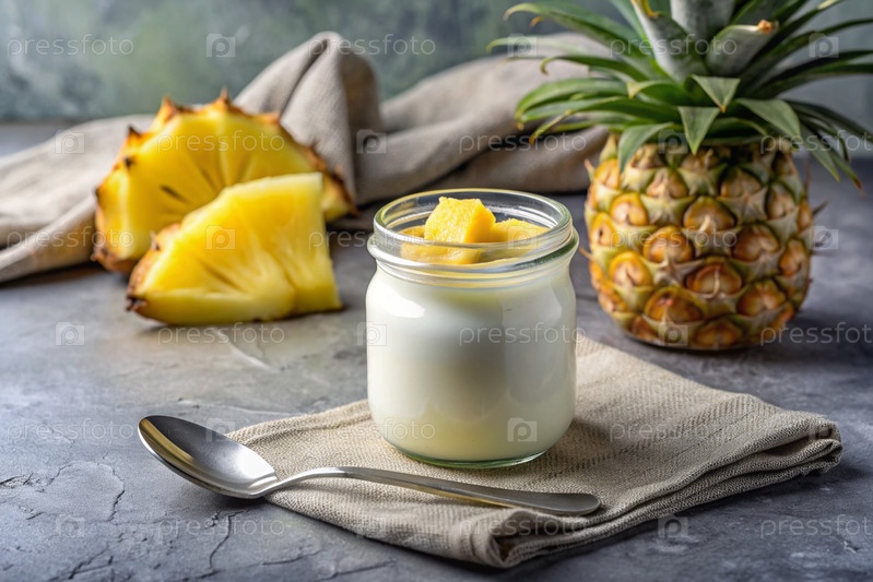 Домашний ананасовый йогурт со свежими ананами, винтажной ложкой и полотенцем на стильном сером фоне