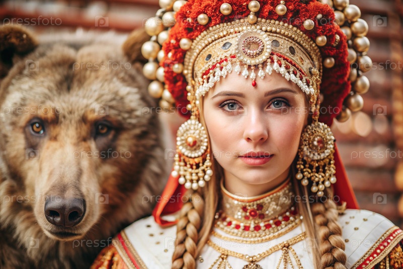 Красивая девушка в традиционном русском национальном костюме.Перед живым медведем.Портрет символизирует традиции и красоту русского народа