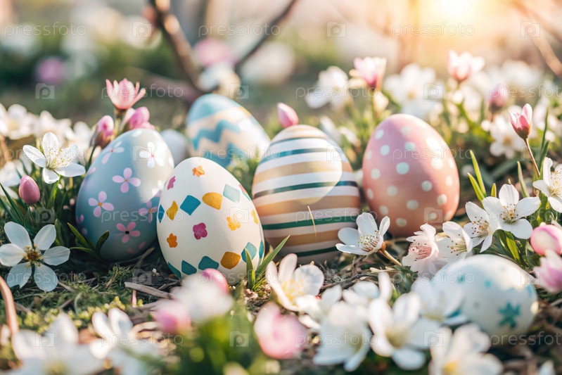 Красивый фон с пасхальными яйцами и весенними цветами