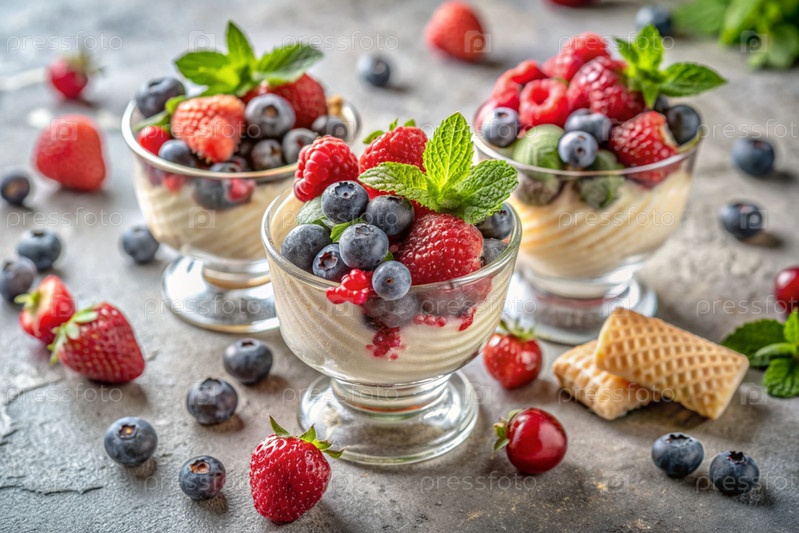 сладкий десерт. любовь к мороженому. ванильные шарики для мороженого и свежие клубники, малины и черника. баннер, реклама