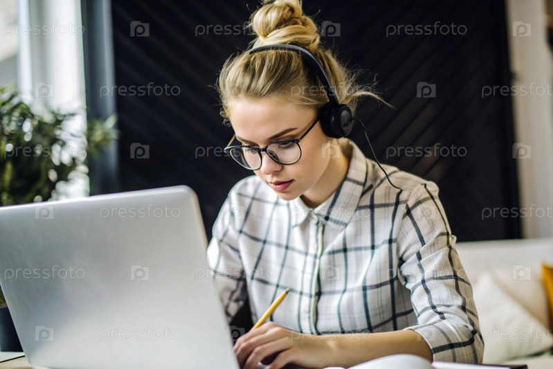Молодая женщина фрилансер в очках и наушниках работает на ноутбуке или делает покупки в интернет-магазине