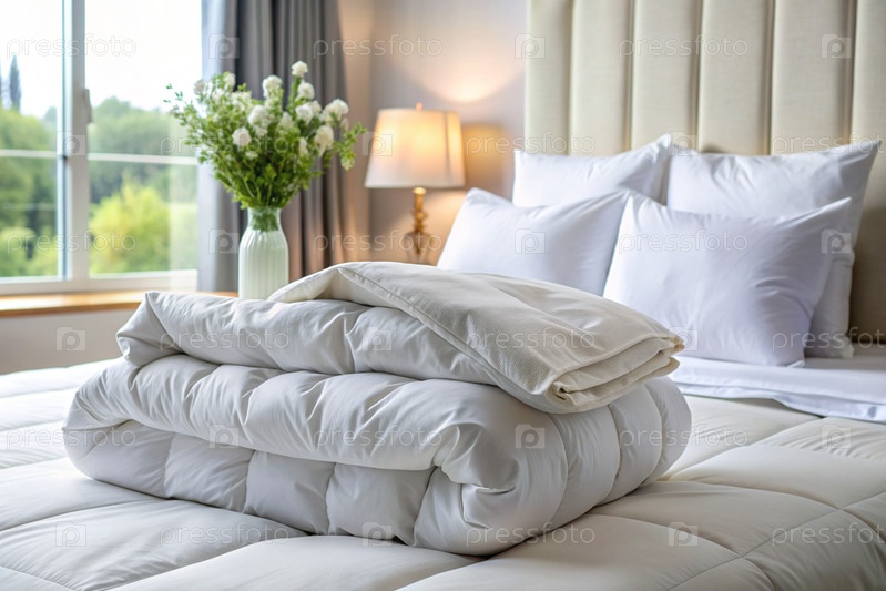 Подготовка к холодному зимнему сезону, уборка дома, гостиничный или домашний текстиль.Белое сложенное одеяло лежит на постели для макияжа