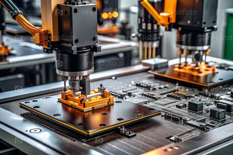 Автоматизированное производство электронных устройств. Современные роботизированные манипуляторы на сборочной линии чипов и печатных платок на современном электротехническом заводе. Установка компонентов на доске