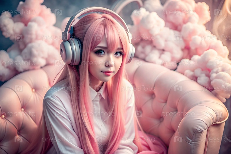 Молодая красивая японская девушка с розовыми волосами в аниме слушает музыку на беспроводных наушниках в розовых облаках