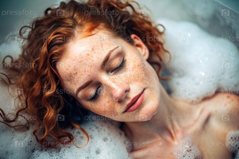 Близкий план красивой рыжеволосой женщины с веснушками и кудрявыми волосами, без макияжа. Она принимает баню из пузырьков. На заднем плане интерьер ванной комнаты в стиле лофт