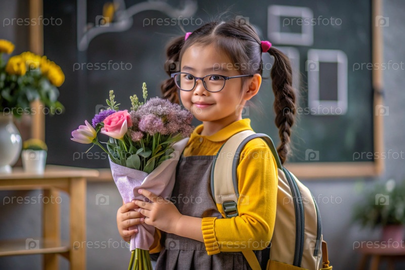 Первоклассный азиат с очками на доске. Девушка держит цветы в руках. Ребенок пойдет в школу впервые. Ребёнок с рюкзаком, книгой и цветами. Возвращение к школе