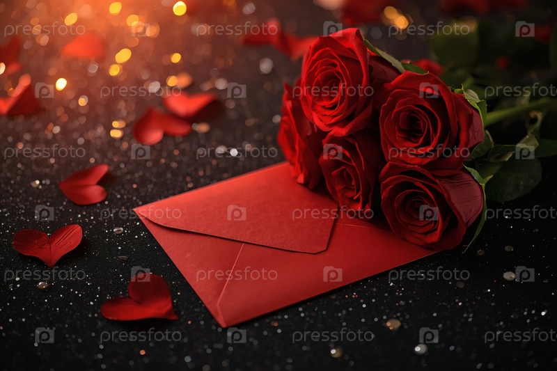 Концепция Дня святого Валентина.Окончание букета красных роз и любовного письма на темном фоне в День Святого Валентина
