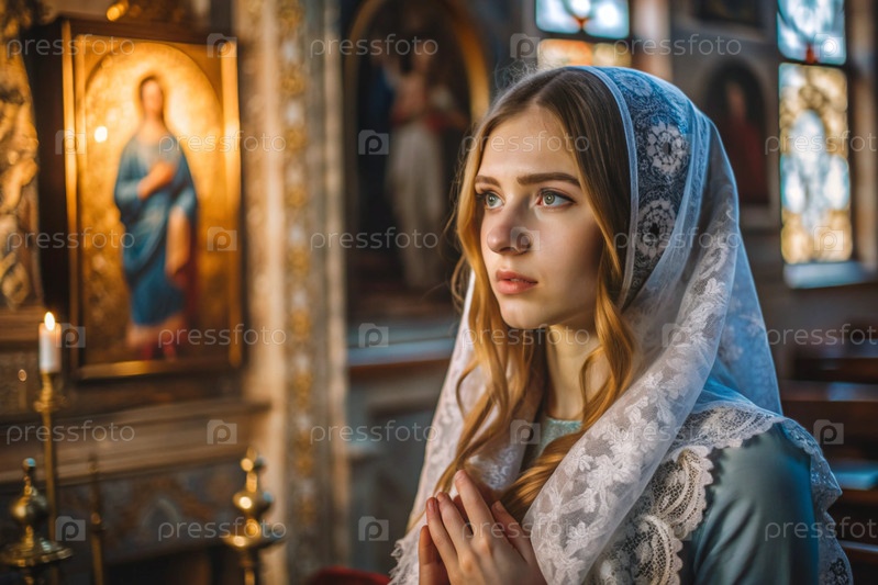 Портрет красивой молодой женщины с платками в православной церкви.Девушка молится в церкви среди икон