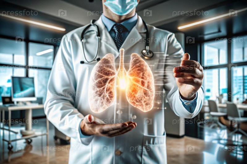 Врач в белом пальто демонстрирует голографическую модель человеческого легкого.Развитие медицинских технологий с использованием искусственного интеллекта