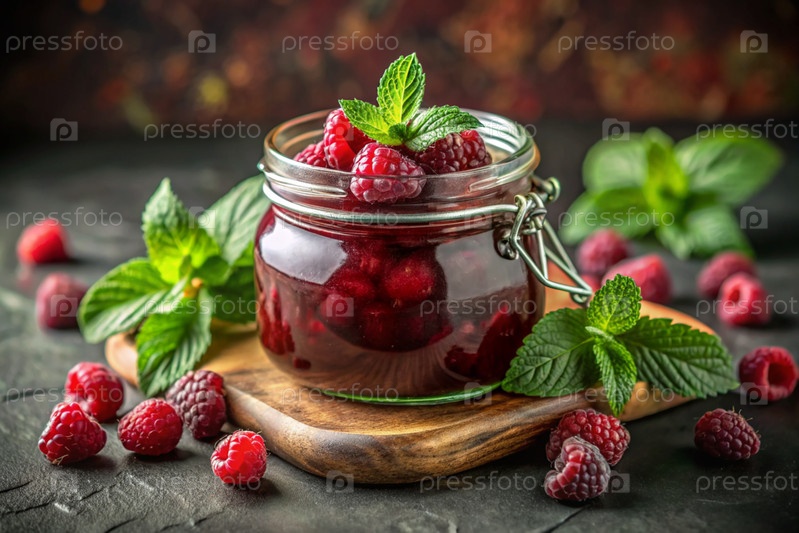 Банка домашней малины, здоровый варенье с мятой на черном фоне.Сохранение и уборка летом