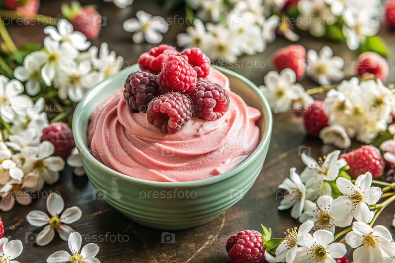 Свежие молочные продукты, творог с свежими малинами в керамических блюдах Концепция натурального диетического питания Здоровая пища