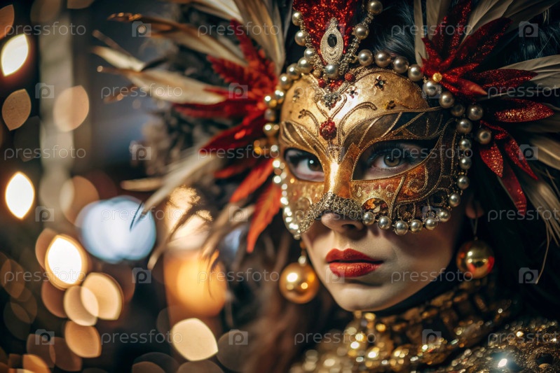 Карнавал Венеции.Закрытие женщины в украшенной карнавальной маске.Яркие цвета передают атмосферу празднования и роскоши