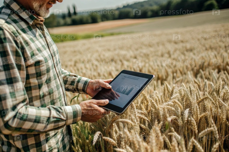 Agronom использует программное обеспечение для обработки онлайн-данных для цифрового сельского хозяйства.Фермер с планшетом в руках стоит на пшеничном поле