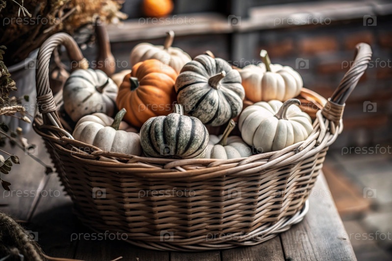 Осенний фон красочные декоративные тыквы в плетеновой корзине богатый урожай концепция Хэллоуина
