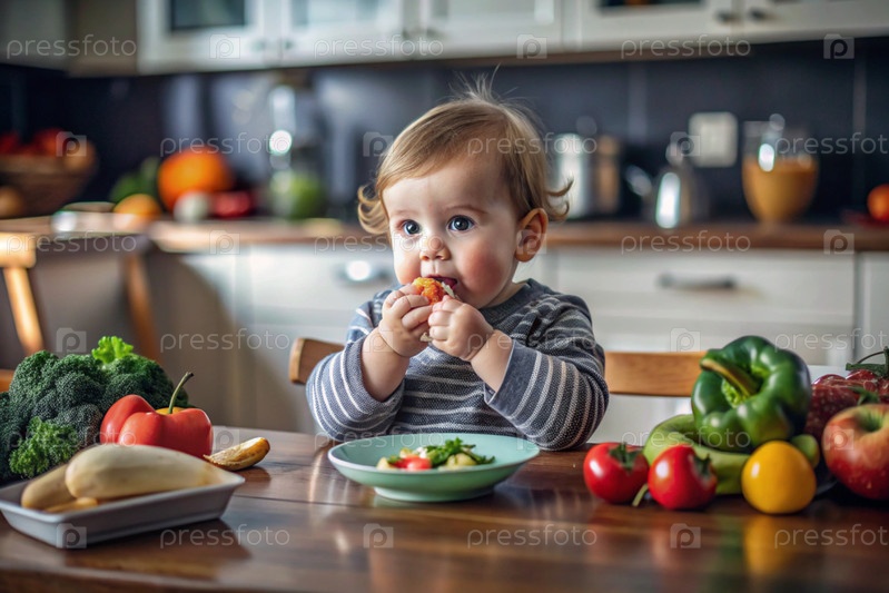 Здоровое детское питание. Первая еда. Кормить ребенка. Милый ребенок ест свежие овощи
