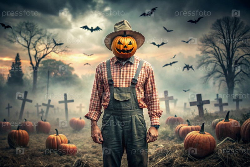 Концепция Хэллоуина. Ужасная. Страх. Устрашающий богий с тыквенной головой, квадратной рубашкой и бабочкой. Баннер, открытка