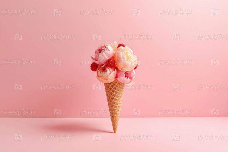Минимальная студийная фотография. Вафельный конус. Наполненный тонкими пастельными цветами, напоминающими пионы или розы, с многослойными лепестками в мягких розовых и персиковых оттенках на розовом фоне