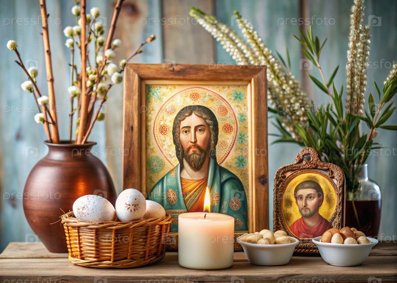 Православный Пасхальный торт, окрашенные яйца, иконы, лица святых, цветы, церковные свечи и пасхальное украшение на деревянном столе в старом деревенском доме