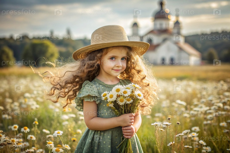 Всероссийский день семьи, любви и верности Красивая маленькая кудрявая девочка в соломенной шляпе с букетом ромашки на фоне поля. День святого Валентина Петра и Февронии