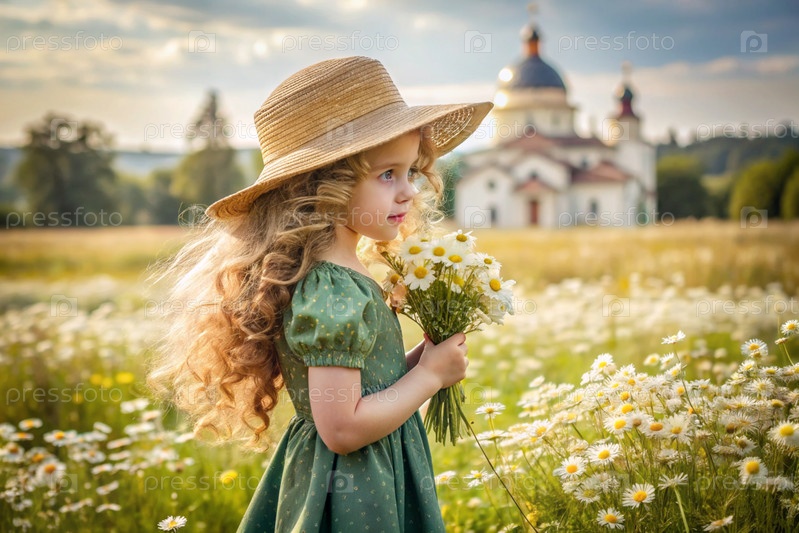 Всероссийский день семьи, любви и верности Красивая маленькая кудрявая девочка в соломенной шляпе с букетом ромашки на фоне поля. День святого Валентина Петра и Февронии