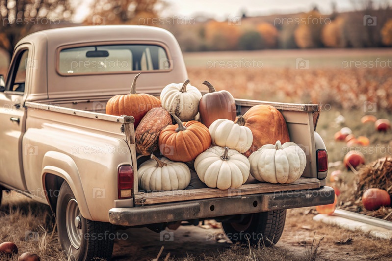 Осень, осенний дизайн.Большой урожай тыквы на заднем сиденье ретро-пикапа, крупный план