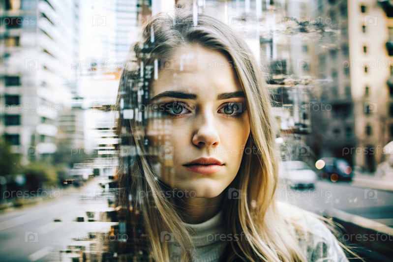 Портрет молодой женщины.Концептуальное искусство Клубовое изображение на фоне города с двойной экспозицией и визуальными эффектами