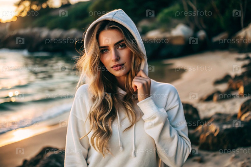 Красивая молодая женщина в белой свитерке на пляже. макеты шаблонов для дизайна гофри, печатные площади для логотипа или дизайна